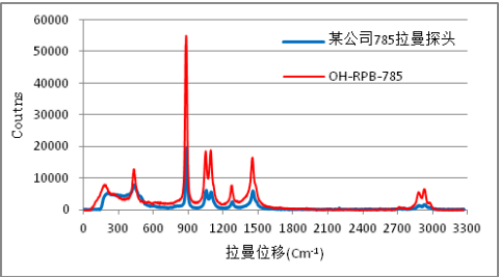 比色皿中的酒精紅色譜線為RPB-785拉曼探頭系列中某款產品獲取的拉曼光譜實驗中積分時間統一為5s,采用相同配置的激光器和光譜儀
